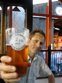 Real ale. Trains. Hog Roast. Men. Beerguts. Beards. These are the essential ingredients of the annual Chappel Beer Festival, held at a railway museum (a boozeum, if you will) in Essex. Spratticus, Shelly, Ian and I set off from Liverpool Street, by train of course, yesterday afternoon. We were hoping that we'd be allowed in despite our lack of facial hair, beerguts and in Shelly's case, testicles. Fortunately the Real Ale Gods were smiling on us and for £5 we not only gained admission but also our own returnable commemorative pint glass each. Wa-hey! Straight to the festival's smallest bar then, the Shunter's Arms, situated in a goods wagon, for our first pint. I believe mine was Marsdon Gold, but more precise details of the evening are a little hazy for some reason. Much vintage railway carriage based quaffing of amusingly named draughts followed as we were joined by Adam, who had arrived with a considerable amount of cheese and a pair of doctors. We did the rounds of the other bars, based in the train sheds, and avoided the horrendous covers band belting out 'classics', before catching the 11.00 train back to London. A first class evening all round. There's talk of cycling and camping next year. Bring it on!